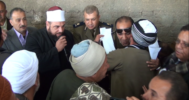 بحضور قيادات المديرية والأمن العام والبحث الجنائي ولجنة المصالحات بالمحافظة ورجال الدين والقيادات الشعبية والتنفيذية بالمحافظة وعدد من أبناء العائلتين وأهالي القرية بدوار عمدة القرية .