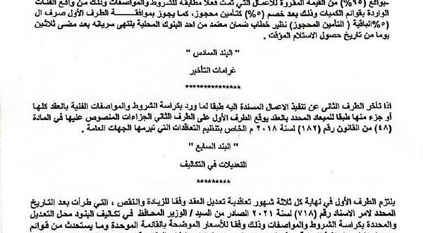 بند رقم (7) ينص علي التزام الطرف الاول بتعديل العقد المبرم كل نهاية ثلاثة اشهر تعاقدية وذلك مخالفا لقانون 182 لسنة 2018 الذي ينص علي ان يكون فروق الاسعار كل نهاية ثلاثة اشهر تعاقدية للعملية التي تذيد متها عن 6 اشهر تعاقدية .