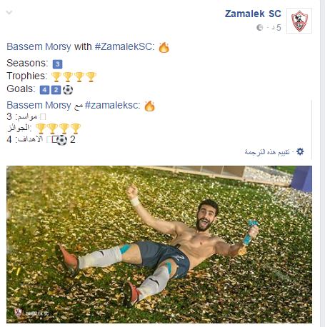 نشرت الصفحة الرسمية لنادي الزمالك، عبر موقع التواصل الاجتماعي «فيس بوك»، صورة لباسم مرسي مهاجم الفريق الأبيض، للاحتفال بتألق مهاجم الفريق الأبيض.