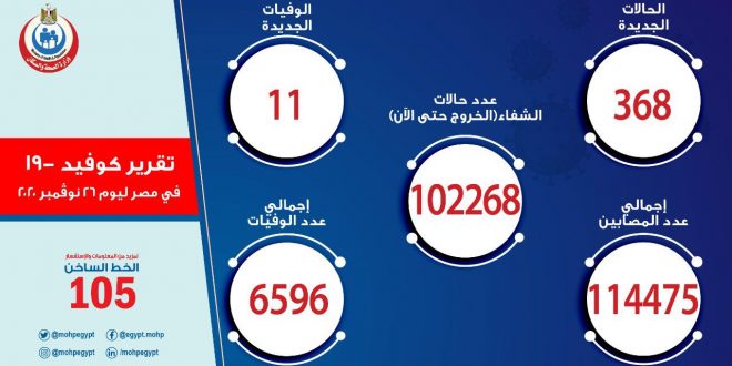 أعلنت وزارة الصحة والسكان، أمس الخميس، تسجيل 368 إصابة جديدة بفيروس كورونا المستجد، لافتًة إلى وفاة 11 حالة جديدة.