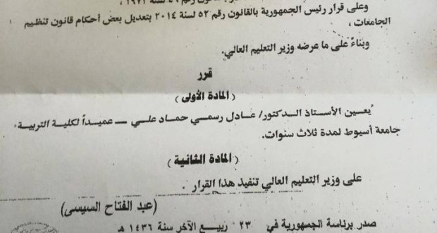 أصدر الرئيس عبد الفتاح السيسي، قرارًا جمهوريًا بتعيين الدكتور عادل رسمى حماد النجدى، عميدًا جديداً لكلية التربية جامعة أسيوط، لمدة ثلاث سنوات.