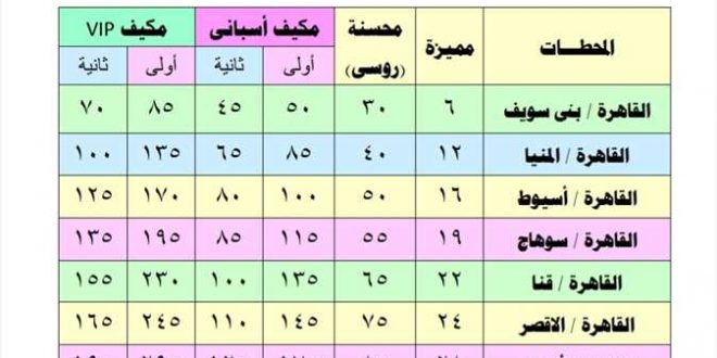 كشف جدول لأسعار تذاكر قطارات الركاب التي تعمل بين القاهرة- اسوان عن وجود ٥ انواع من القطارات، منها ٤ جلوس والخامس نوم، حيث تراوحت اسعار الجلوس ما بين ٦ جنيهات إلى ٨٥ جنيها بين القاهرة- وبني سويف، و٢٨ و٢٩٥ جنيها حتي اسوان.
