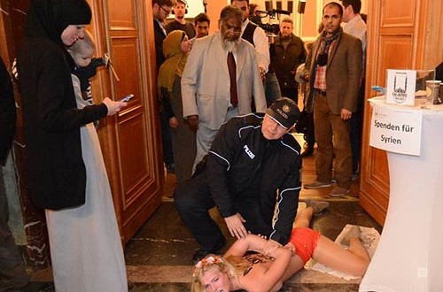 اتخذ مؤتمر برلين الإسلامي منحنى مختلفًا بالأمس، بعد اقتحامه من قبل 3 نساء عاريات الصدر تابعات لمنظمة فيمن، واضطرار المسئولين لإخراجهن بالقوة.