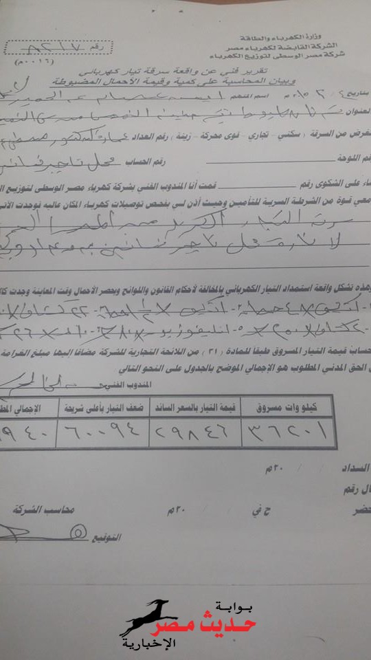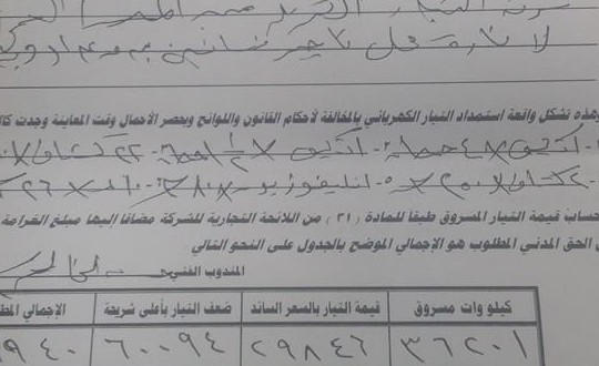 وبفحص المحضر وجد ان صاحب المحل عندة عداد كهرباء ولم يقم بتركيبة وقام بسرقة التيار من المد العمومى.