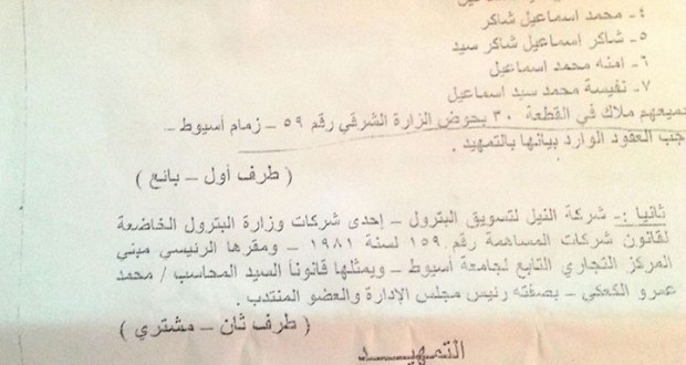 فالعقد المؤرخ في 4 /9/2014 بين كل من على محمد على المحامى والوكيل عن الملاك للأرض وبين شركة النيل لتسويق البترول ويمثلها محمد عمرو الكعكى بصفتة رئيس مجلس الإدارة ، ترى في هذا العقد العجب العجاب ، فمن تحليل العقد وجدنا الاتى: