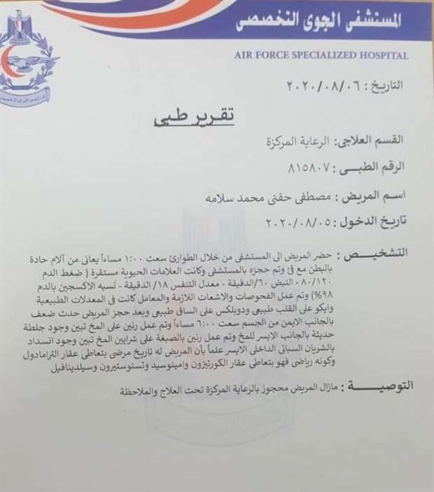 وبحسب التقرير الطبى الصادر من المستشفى الجوي التخصصي، أن الشاب الراحل والذي تبين أن اسمه الحقيقي مصطفى حفني محمد سلامة وشهير بـ “مصطفى حفناوي”، ودخل قسم الرعاية المركزة بالمستشفى الجوي التخصصي في 5 أغسطس الجاري، وأوضح أن المريض حضر إلى المستشفى ويعاني من آلام حادة بالبطن مع قئ وتم حجزه بالمستشفى، وكانت العلامات الحيوية مستقرة ، ضغط الدم 120/80، النبض 60/ للدقيقة، وتم عمل الإشاعات والتحاليل وأيكو على القلب ودوبلكس على الساق طبيعى.