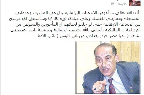 اعلن حيدر بغدادى عضو مجلس الشعب السابق على صفحتة على مواقع التواصل الاجتماعى الفيس بوك ترشحة فى الانتخابات البرلمانية القادمة متحديا جماعة الاخوان وبلطجيتهم قائلا: