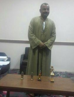 المدعو / عبد الناصر . ك. أ 43سنةمدرس ومقيم فزاره ــ دائرة المركز .. وبحوزته (عدد 1 تمثال طوله 12سم من العاج أصفر اللون و عدد 2 قطع من البلاستك علي شكل تابوت مذهب متوسطان الحجم وعدد 1 قطعة من العاج متوسطة الحجم صفراء اللون ) يشتبه في أثريتهم .. بقصد الاتجار .