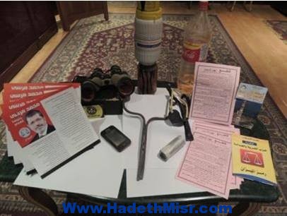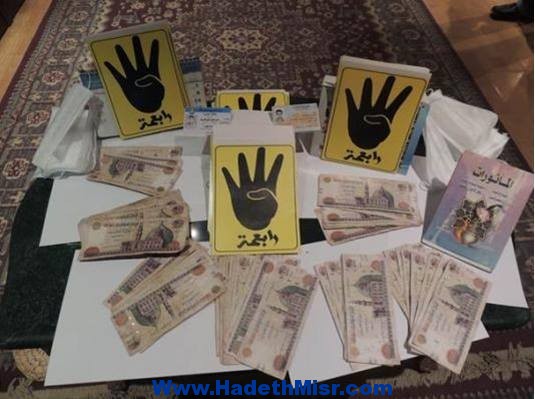 وبحوزتهم (السيارة رقم “ف ر د 9435 ” , مبلغ مال قدرة 15000 جنية , أوراق تنظيمية , مطبوعات مدون عليها اشارة رابعة , 500 منشور , نظارة ميدان , نبلة حديد كبيرة , علبة بداخلها مادة برمنجانات البوتاسيوم , علبة بوية , عبوة بنزين , وعبوة فورمالين ) .