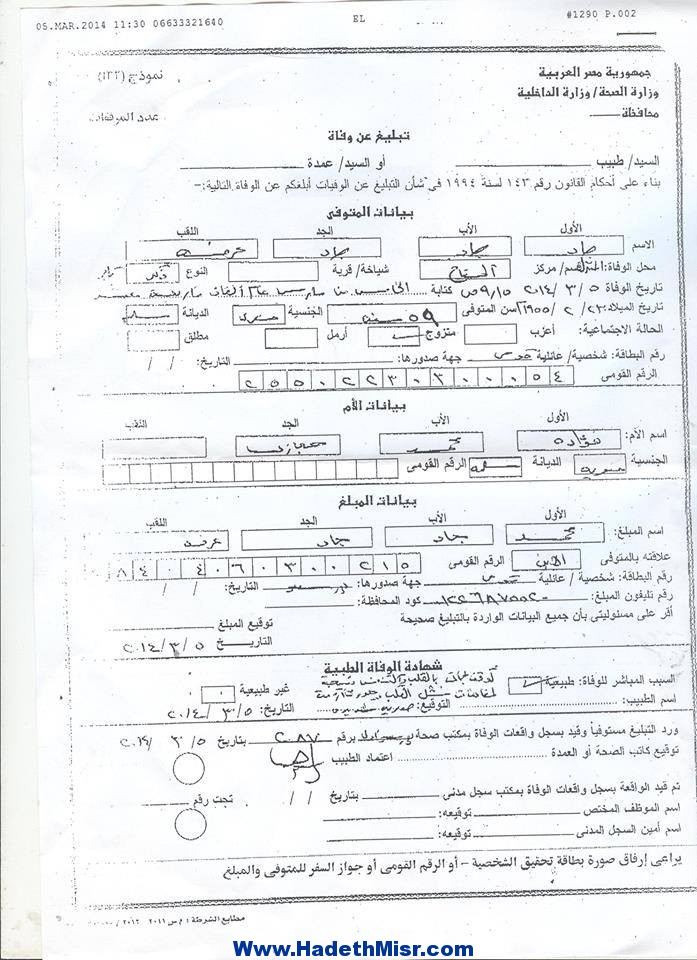 لما تردد حول حول مصرع رجل مسن عقب انهيار سقف إحدى الشقق السكنية على رأسه بمنطقة السلام السريع بحي المناخ، وذلك أثناء إزالة إحدى العمارات الآيلة للسقوط. مشيرا بان الحاج جاد جاد عرفة قد توفي نتيجة توقف فجائي بالقلب والتنفس نتيجة لمضاعفات فشل القلب وحدوث ازمة صدرية شدسدة