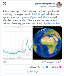 قبل أيام، نشر هوغربيتس تغريدة على منصة تويتر قال فيها: “اليوم يتقارب اقترانان كوكبيان مع عطارد والزهرة، مع اقترانين قمريين مع المشتري وأورانوس. وفي 6 سبتمبر حدث تقارب آخر مع عطارد والزهراء”، وتوقع وقوع هزات قوية في الفترة بين 5 و7 سبتمبر.