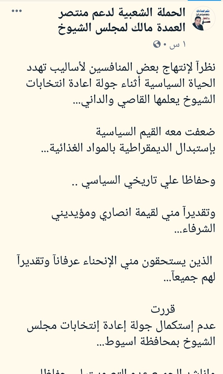 نشر المحامى القبطى المرشح لمجلس الشيوخ منتصر العمدة مالك أبن قرية العزية مركز منفلوط بأسيوط بانه منسحب من سباق جوله الاعادة لمجلس الشيوخ بأسيوط بسبب أستبدال الديمقراطية المواد الغذائيه.. قائلا:نظرآ لإنتهاج بعض المنافسين لأساليب تهدد الحياة السياسية أثناء جولة اعادة انتخابات الشيوخ يعلمها القاصي والداني…ضعفت معه القيم السياسية بإستبدال الديمقراطية بالمواد الغذائية…وحفاظا علي تاريخي السياسي ..وتقديرآ مني لقيمة انصاري ومؤيديني الشرفاء…الذين يستحقون مني الإنحناء عرفانآ وتقديرآ لهم جميعآ…قررت عدم إستكمال جولة إعادة إنتخابات مجلس الشيوخ بمحافظة اسيوط…واناشد الجميع عدم التصويت لي حفاظا وتقديرا لقيمتكم وقدر صوتكم الشريف.