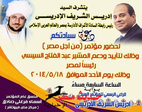 فى مدينة ادفو باسوان اقام اتلاف قبائل مركز ومدينة ادفو مؤتمر تاييد المشير عبد الفتاح السيسى بحضور الدكتورة هنادى يوسف الشريف والسفير محمود كارم محود الحميدانى ورئيس اتلاف القبائل العربية بسيناء ومطروح وبحضور مكثف من كبار قبائل ادفو ومشاركة العنصر النسائى بقوة فى المؤتمر .