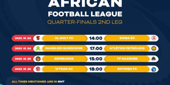 بالنسبة لمباريات الإياب، سيواجه الأهلي نظيره سيمبا يوم 24 أكتوبر، وفي نفس اليوم سيكون هناك لقاء بين صن داونز وبترو أتلتيكو. وفي 25 أكتوبر، سيلتقي فريق مازيمبي بالترجي، وسيواجه الوداد نظيره إنيمبا النيجيري في اليوم نفسه.