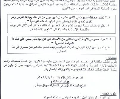 تنظم الهيئة المصرية العامة للتنشيط السياحى بمحافظة أسيوط بالتعاون مع مديرية التربية والتعليم مسابقة سياحية لطلاب وطالبات المدارس المختلفة بمناسبة عيد أسيوط القومى .