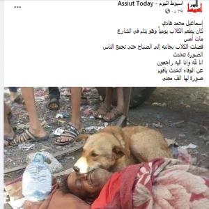 الواقعة التي تداولها رواد مواقع التواصل الإجتماعي في مصر، أظهرت صورة لرجل متوفي في وسط الشارع تحيط به الكلاب حزناً علي وفاته، وأثار تداول الصورة حالة من الحزن والتأكيد علي أن الكلاب لها وفاء كبير للإنسان علي عكس ما يقوم به الناس مع بعضهم البعض .