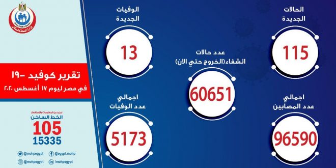 وذكر “مجاهد” أن إجمالي العدد الذي تم تسجيله في مصر بفيروس كورونا المستجد حتى اليوم الإثنين، هو 96590 حالة من ضمنهم 60651 حالة تم شفاؤها، و 5173 حالة وفاة.