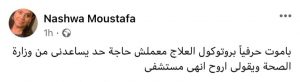 كتبت الفنانة نشوي مصطفي عبر حسابها الشخصي علي مواقع التواصل الاجتماعي ” فيس بوك ” مناشده وزارة الصحة. ” بموت حرفيًا بروتوكول العلاج معملش حاجة حد يساعدنى من وزارة الصحة ويقولى اروح انهى مستشفى ” .
