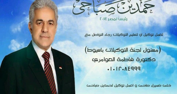يكافح أنصار المرشح الرئاسي المحتمل حمدين صباحي من أجل موطئ قدم لهم في سباق الانتخابات الرئاسية في مصر، والتي يعد قائد الجيش السابق المشير عبد الفتاح السيسي، هو المرشح الأكثر حظاً بها. وفي تقرير أوردته “العربية نت”، أعلنت الحملة الانتخابية لصباحي عن الانتهاء من جمع الحد الأدنى من إقرارات التأييد اللازمة للترشح، في 5 محافظات فقط، هي القاهرة، الجيزة، القليوبية، كفر الشيخ، والدقهلية، بواقع 1000 توكيل على الأقل بكل محافظة، بينما المطلوب هو 1000 توكيل على الأقل في 15 محافظة، من إجمالي 25 ألف توكيل كشرط للترشح.