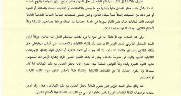 صرح المهندس / حمدي عز – الامين العام للنقابة العامة للسياحيين لبوابة حديث مصر الاخبارية – ان القرار الذي اصدرته وزارة السياحة بعدم التعامل مع النقابات والاتحادات المستقلة هو مؤشر خطير يعبر عن توجة الحكومة والنظام الحالي الي العودة الي زمن ماقبل ثورة 25 يناير 2011 واننا نعيش بالفعل ردة وتعدي علي حقوق شعب مصر والتي منها ثمرته في تاسيس نقاباته المستقله عن الحكومة باجهزتها الامنية التي كانت تتوغل داخل النقابات بل وتتحكم في اختيار قاداتها . حيث صرح سيادته ان القرار الذي اصدرته وزارة السياحة من مدير مكتب الوزير السيد /محفوظ علي – هو تعدي وانتهاك علي لدستور الذي افتي عليه الشعب فهو يتنافي مع الماده (76) من الدستور المصري الصادر بتاريخ 18 من فبراير سنة 2014 م ” حرية إنشاء النقابات والاتحادات والتعاونيات مكفولة وتكون لها الشخصية الاعتبارية، وتقوم على أساس ديمقراطي، وتمارس نشاطها بحرية، وتسهم في رفع مستوى الكفاءة بين أعضائها والدفاع عن حقوقهم، وحماية مصالحهم، وتكفل الدولة إستقلال النقابات والإتحادات ، ولا يجوز حل مجالس إداراتها إلا بحكم قضائي ” كما ان القرار فيه انتهاك صارخ بل وصريح للماده رقم ( 93 ) ” تلتزم الدولة بالاتفاقيات والعهود والمواثيق الدولية لحقوق الإنسان التي تصدق عليها مصر، وتصبح لها قوة القانون بعد نشرها وفقا للأوضاع المقررة”. وقد اضاف الامين العام ان هذا القرار ليس قرارا فرديا من مدير مكتب الوزير كما ادعي وزير السياحة في مكالمته مع نقيب السياحيين وانه لا يعلم عنه شيئا لان لو كان هذا صحيح فاننا نعيش كارثه – وهو ان الوزير الفعلي لوزارة السياحة بهذا هو السيد /محفوظ علي وليس هشام زعزوع المختار من قبل رئيس الوزراء – فمن المعلوم ان السيد محفوظ علي والسيد هشام زعزوع كلاهما كانوا من حاشية الفاسد السجين وزير السياحة السابق / زهير جرانه وكل منهما يمتلك من مستندات مايدين الاخر . وفي سياق جديد اضاف الامين العام ان النقابه مهمتها رعاية مصالح العاملين بالقطاع السياحي ولا تدخل في صراعات مسئولين ولكنها تمتلك من الانياب ماتحافظ به علي سيادتها لهذا فقد اعلن الامين العام انه سينشر ويعلن عن فساد مسئولي هذه الوزارة علي مدار سنوات بداءا من التلاعب في تراخيص انشاء شركات السياحة الي العبث في تعيينات مديري مكاتب التنشيط السياحي بالخارج الي توزيع حصص الحج الخاص بالدوله علي المعارف والاقارب – ناهيك علي اهدار المال العام . وقد اعلن المهندس / حمدي عز عن شكرة وتقديره لكل النقابات والاتحادات المستقله والزملاء من العمال عن تضامنهم مع النقابة العامة للسياحيين في قضيتهم ضد استبداد وظلم الدولة متمثلا في وزارة السياحة وما اصدرته من قرار .