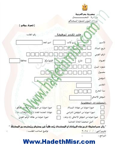 صرح مصدر رفيع المستوى و الذى طلب عدم ذكر أسمه لأنه غير مخول له التصريح لوسائل الإعلام لوكالة ” حديث مصر ” أن إدارة شئون المحاكم بوزارة العدل سوف تعلن يوم الأحد المقبل الموافق 15 مارس و لمدة أسبوعين عن حاجتها لشغل وظائف خالية بجميع المحاكم الإبتدائية على مستوى الجمهورية و سوف يكون إحتياج كل محكمة إبتدائية عدد 40 موظف و كاتب و فنى ، كما حصلت وكالة ” حديث مصر ” على صورة ضوئية من نموذج التقديم لتلك الوظائف ،