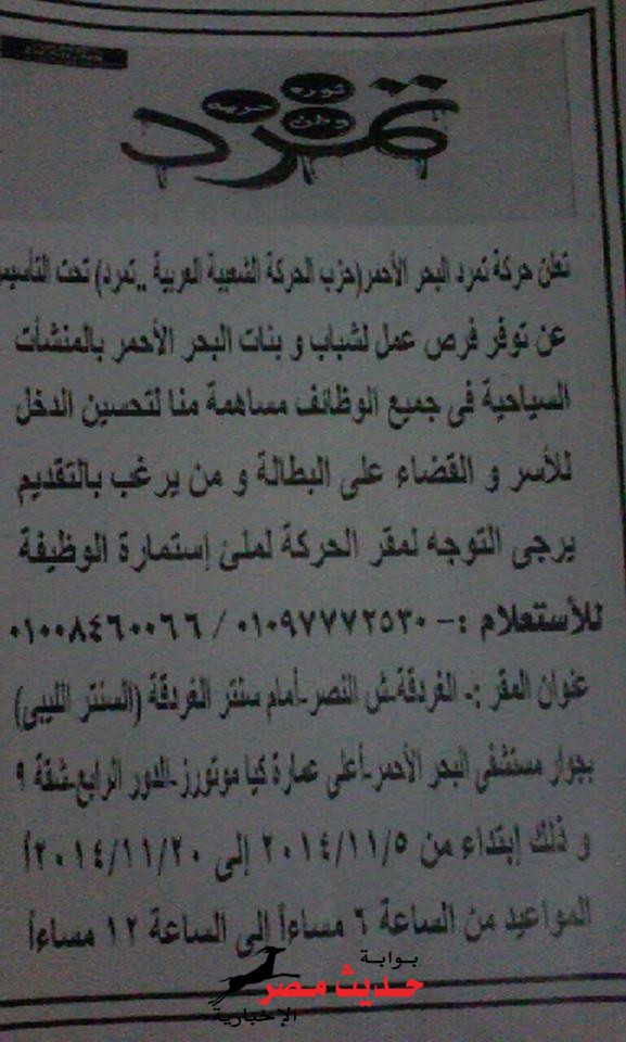 كتب : محمد جمال عبدالقادر كتبت: نشوى عبدالرحيم تعلن حركه تمرد البحر الاحمر (حزب الحركه الشعبيه العربيه تمرد) تحت التاسيس عن توفير فرص عمل لشباب البحر الاحمر بالمنشات السياحيه فى جميع الوظائف مساهمه منا لتحسين الدخل لاسر والقضاء على البطاله …