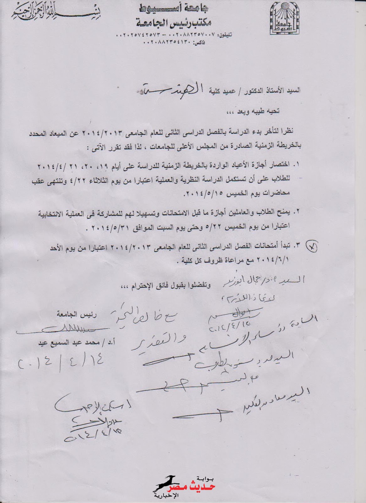أكمل القراءة »بالصور اجازة للعاملين بجامعه اسيوط 10 أيام من 22 مايو وحتى 31 للمشاركة فى العملية الانتخابية وامتحانات الفصل الدراسى الثانى تبدأ فى أول يونيو