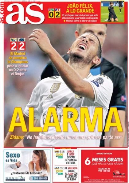تعادل ريال مدريد ضد كلوب بروج بنتيجة 2/2 أمس فى دوري أبطال أوروبا على الصحف الإسبانية الصادرة صباح اليوم، الأربعاء. ونشرت صحيفة “ماركا” صورة للاعبى ريال مدريد على الغلاف وعلقت عليها قائلة: “الغربلة” فى إشارة إلى أن لاعبى الملكى لم يقدموا ما هو مطلوب …