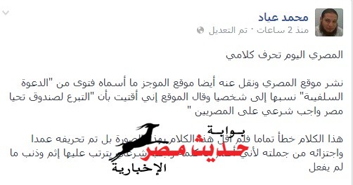 كذب محمد عياد القيادى بحزب النور موقع المصرى اليوم بخصوص فتوى وجوب التبرع لصندوق تحيا مصر قائلا على صفحتة بمواقع التواصل الاجتماعى الفيس بوك: المصري اليوم تحرف كلامي نشر موقع المصري ونقل عنه أيضا موقع الموجز ما أسماه فتوى من “الدعوة …