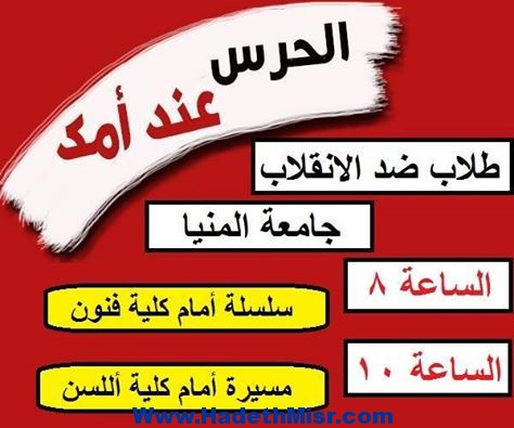 المنيا : جمال عاشور اعلن طلاب ضد الانقلاب بجامعة المنيا عن تنظيمهم غدا لمسيرة مناهضة للجيش والشرطة تبدا المسيرة بسلسلة بشرية داخل الحرم الجامعى من اما مبنى كلية الفنون الجميلة ثم التحرك بمسيرة من امام مبن كلية الالسن بجامعة المنيا …