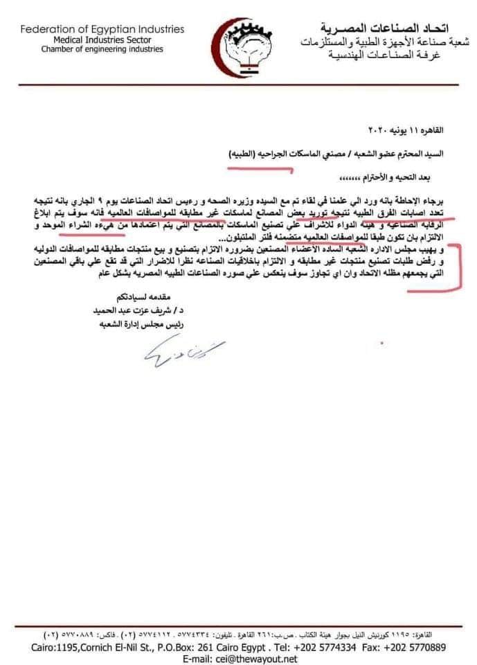 كشف الخطاب الصادرمن اتحاد الصناعات المصرية شعبة صناعة الاجهزة الطبية والمستلزمات والصادر الى عضو الشعبة مصنعى الماسكات الجراحية الطبية ، انه اثناء اللقاء مع وزيرة الصحة ورئيس اتحاد الصناعات يوم 9 يونية الجارى بانه نتيجة اصابات الفرق الطبية بفيروس الكورونا …
